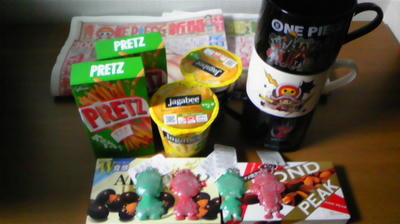 マグカップは、みかんゼリーが仕込まれてます。小さくてびっくりしたけど。全員verと船医ver1個ずつ買って、後日、某くまキャラのマグカップを苦労してゲットしたのにあっという間に割れてしまった悲しみを思い出してもう1個買いに行ったとか。
